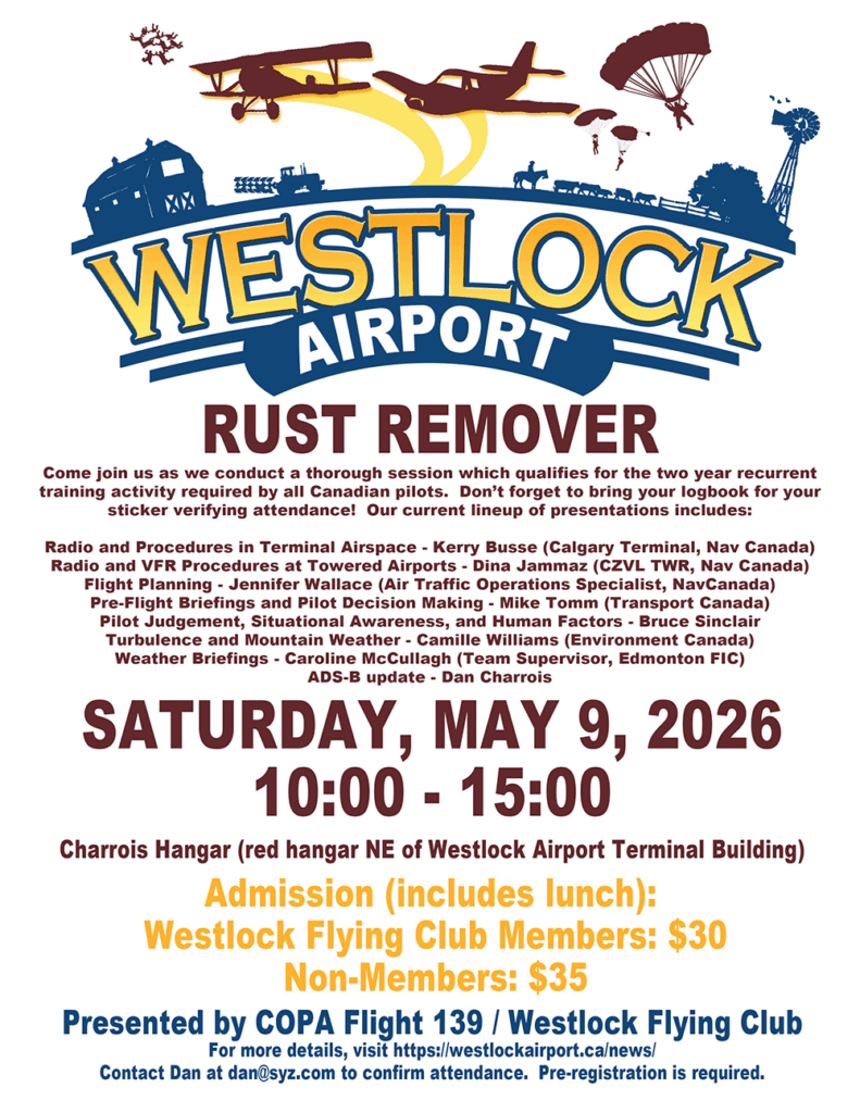 Admission (including lunch) is $35, or $30 if you are a member of the Westlock Flying Club. We are requesting pre-registration to ensure we have enough food and beverages available for everyone, so if you think you might like to attend, please contact Dan at dan@syz.com to confirm attendance. In past years, our Rust Removers tend to draw more than 100 pilots, so it is a great opportunity to not only ensure your flying skills are kept sharp, but also to socialize amongst other pilots in our area!